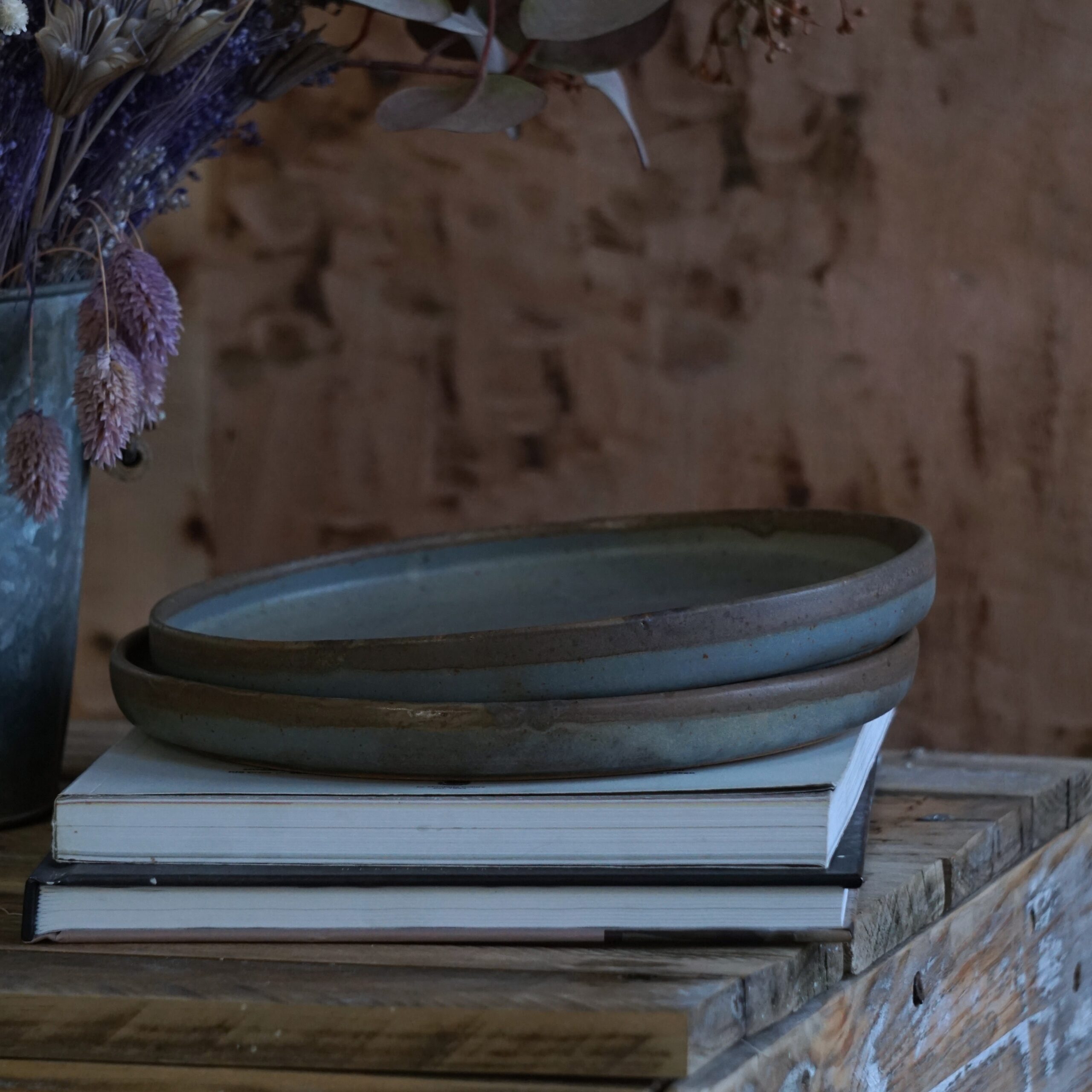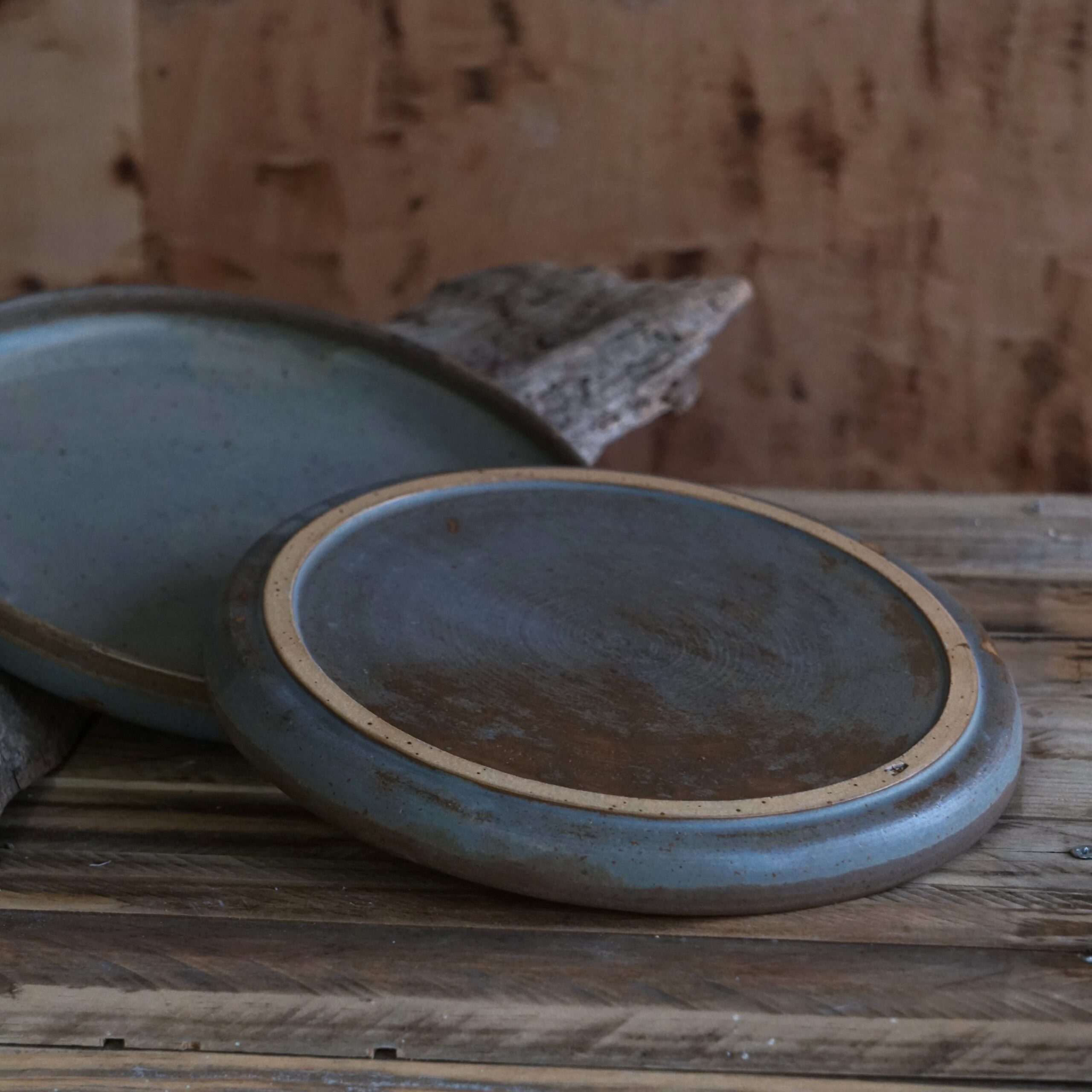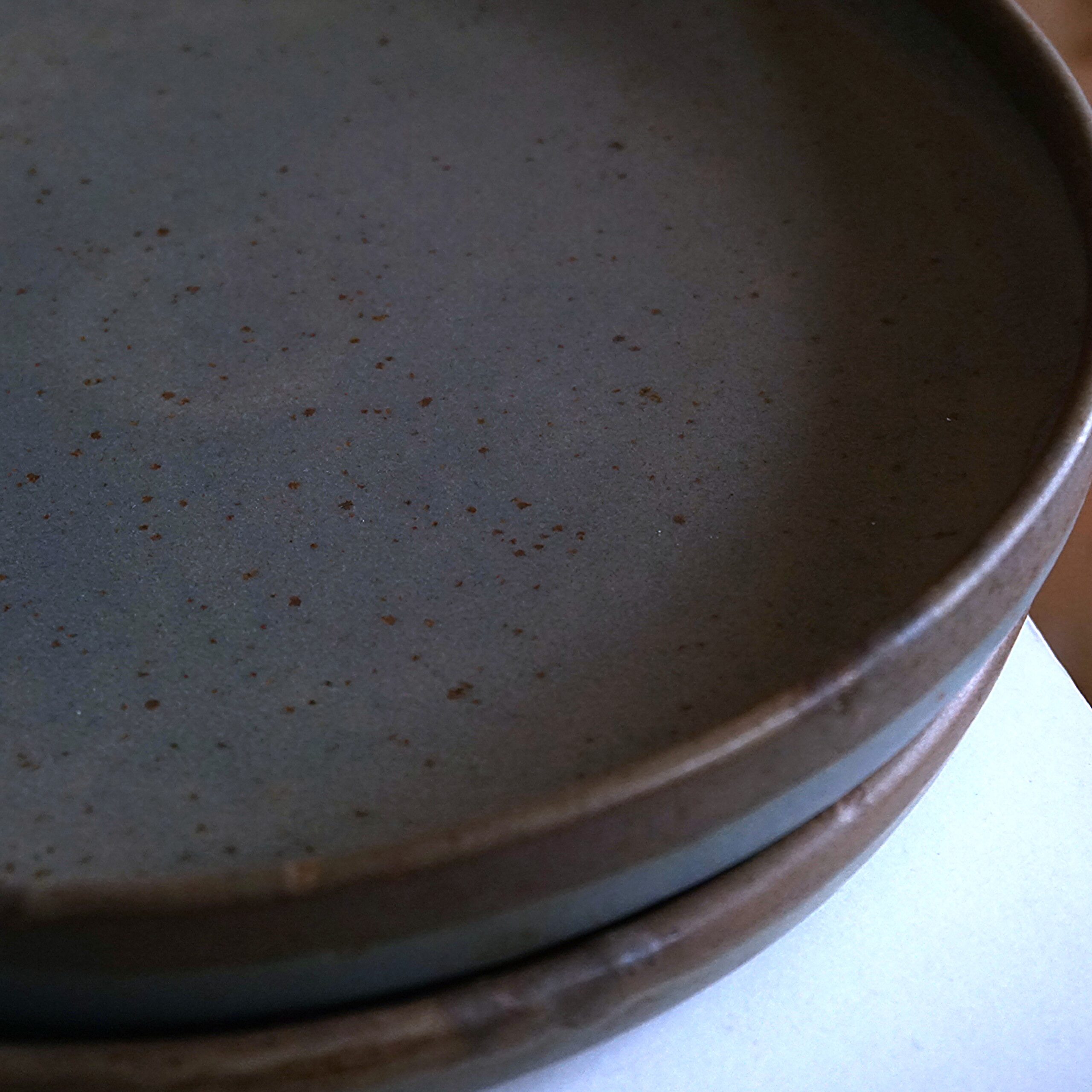 Glaze: Natural grey and blue tones with subtle variations and a speckled texture. Part of the upper rim in brown tones.